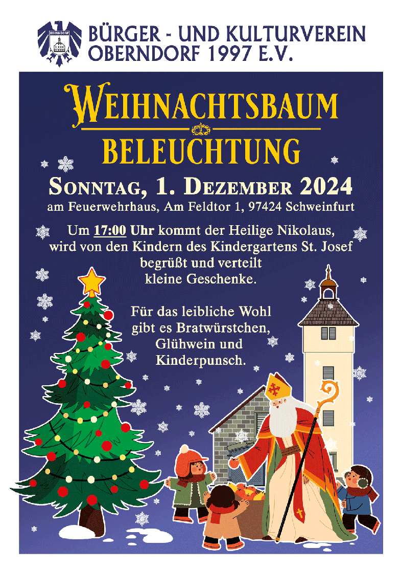 Der BKVO lädt zur Beleuchtungsfeier am Sonntag den 1. Dezember ein. Ab 17 Uhr kommt der Heilige Nikolaus und es wird Bratwürste Glühwein und Kinderpunsch geben. Wir freuen uns euch begrüßen zu dürfen